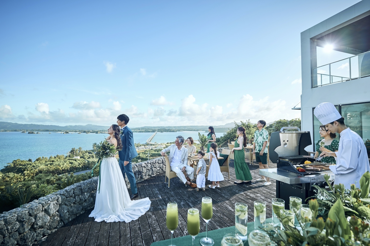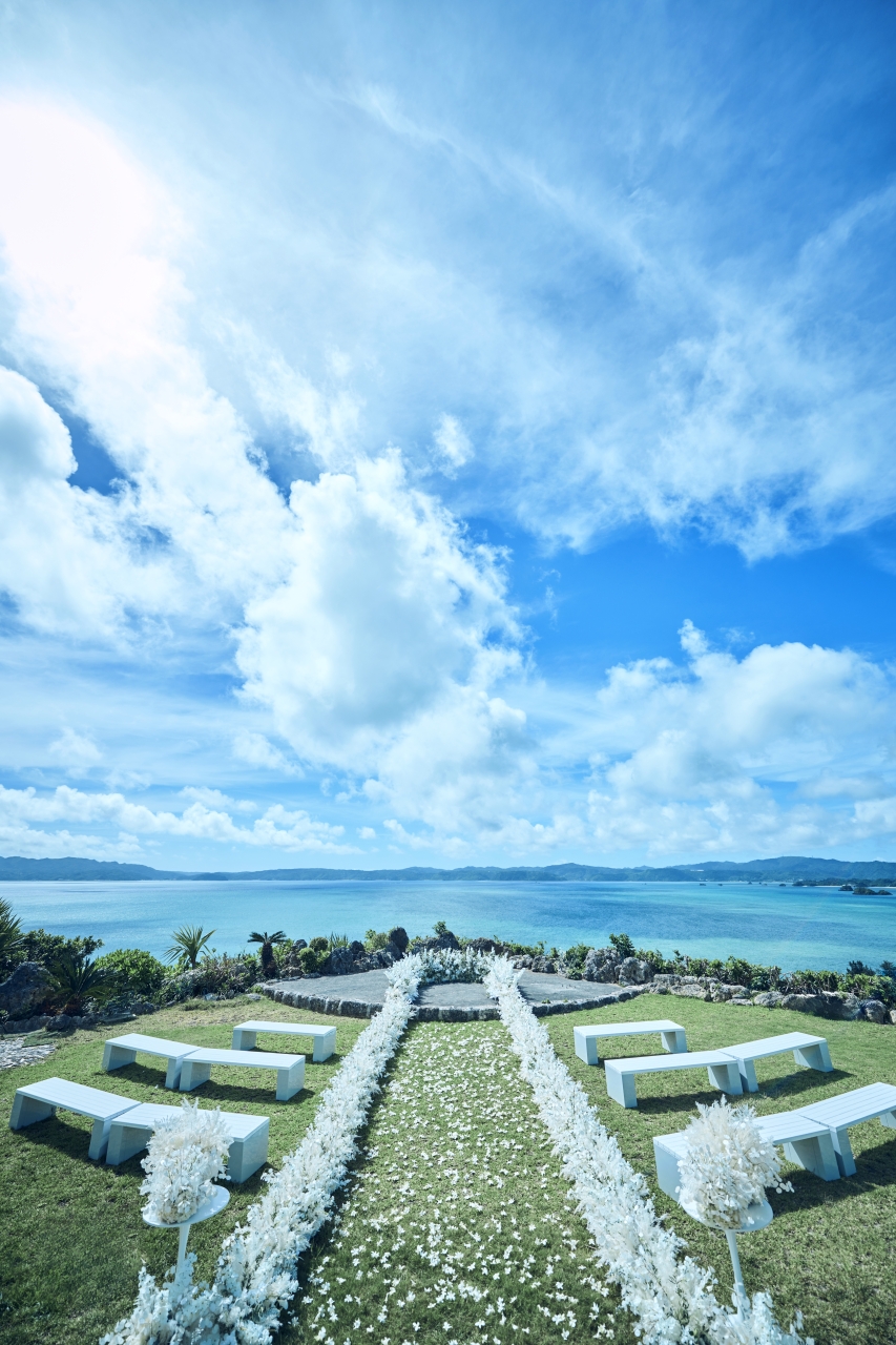 空と海が溶け合う“古宇利ブルー”の絶景に包まれて叶える、開放感あふれるガーデン挙式。