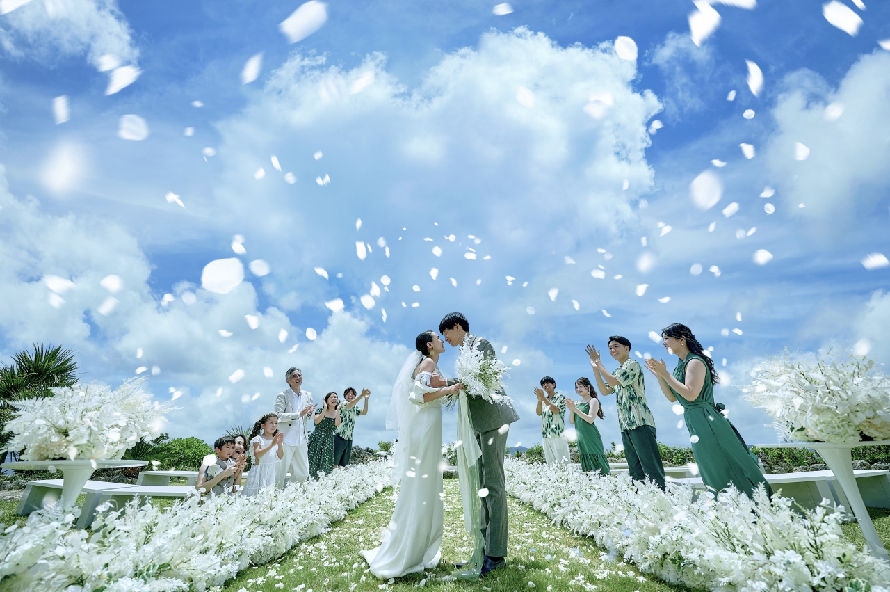 南国のパノラマを望む天然芝の上には、白い花びらを散りばめたバージンロードとチェア